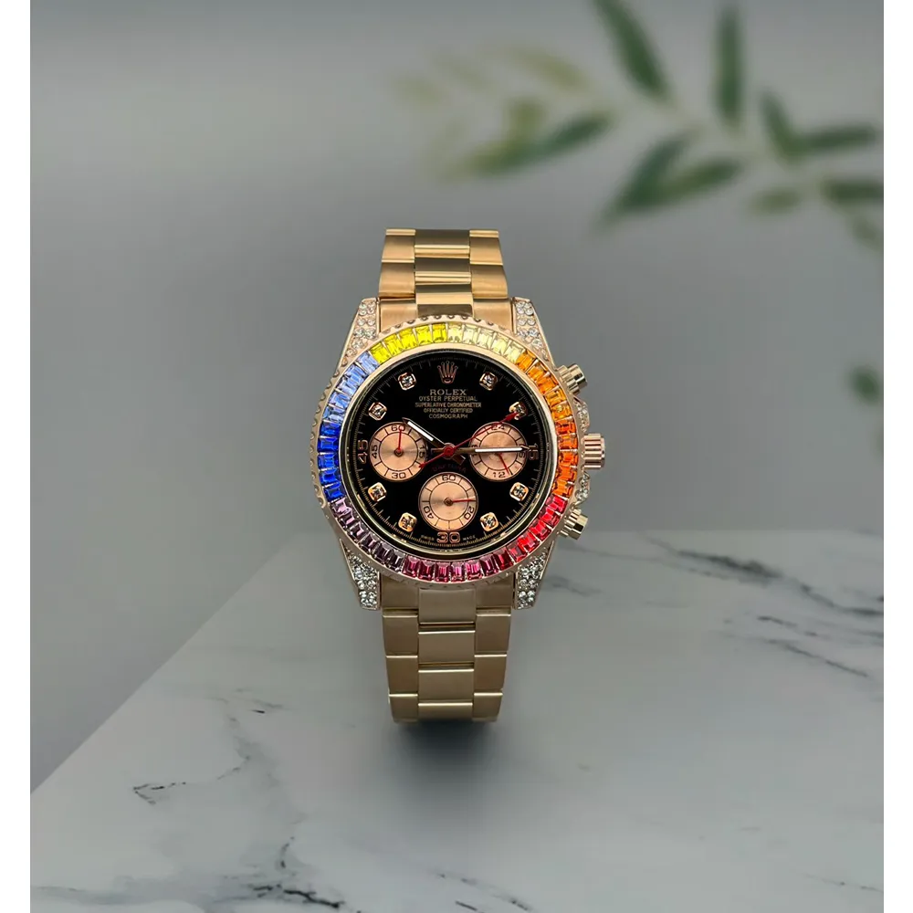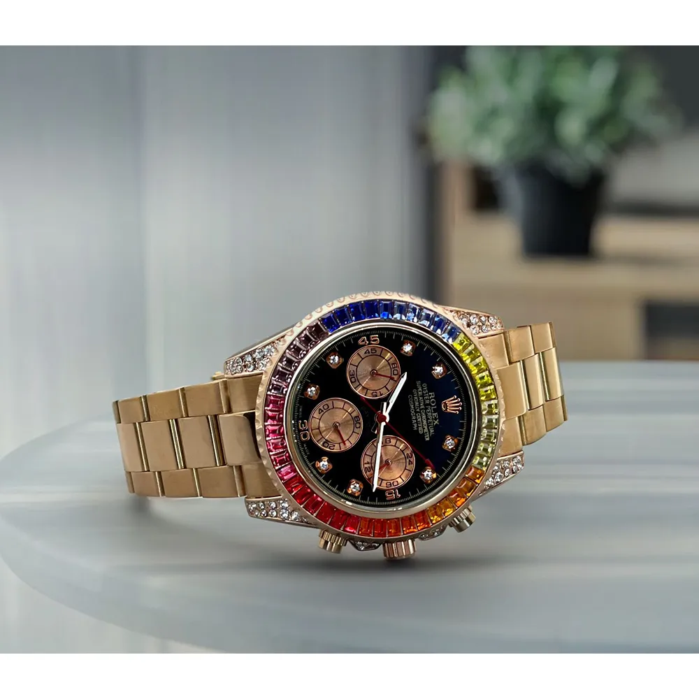 SEO Keywords: Rolex Daytona Rainbow Quartz Watch, Luxury Men’s Watch, Quartz Movement Watch, Black Dial Rolex, Rose Gold Band Rolex, Stylish Men’s Timepiece, Giftable Rolex Watch
