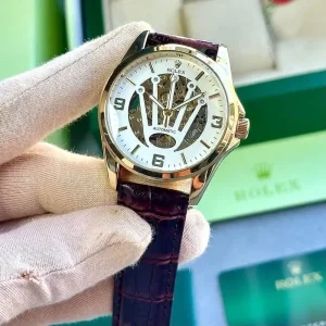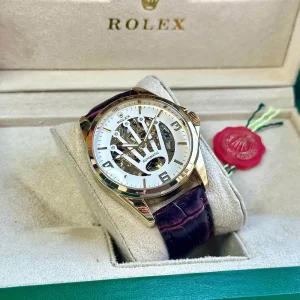 This Rolex Automatic Men’s Watch is a perfect blend of luxury and precision. With its transparent mechanical display, premium leather strap, and detailed craftsmanship, it enhances your style and makes a bold statement wherever you go.