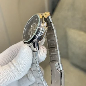 The casing is forged from high-grade stainless steel (ideally 316L or equivalent), giving strength against corrosion, daily wear and sweat. For added edge and aesthetic flair, premium finishes like PVD coating (black, rose gold, gunmetal etc.) may be used to retain colour and resist fade. The crystal over the dial is crafted from scratch-resistant sapphire wherever possible; in more affordable models you might find hardened mineral glass or toughened mineral crystals. These materials protect the face from scratches and maintain clarity.