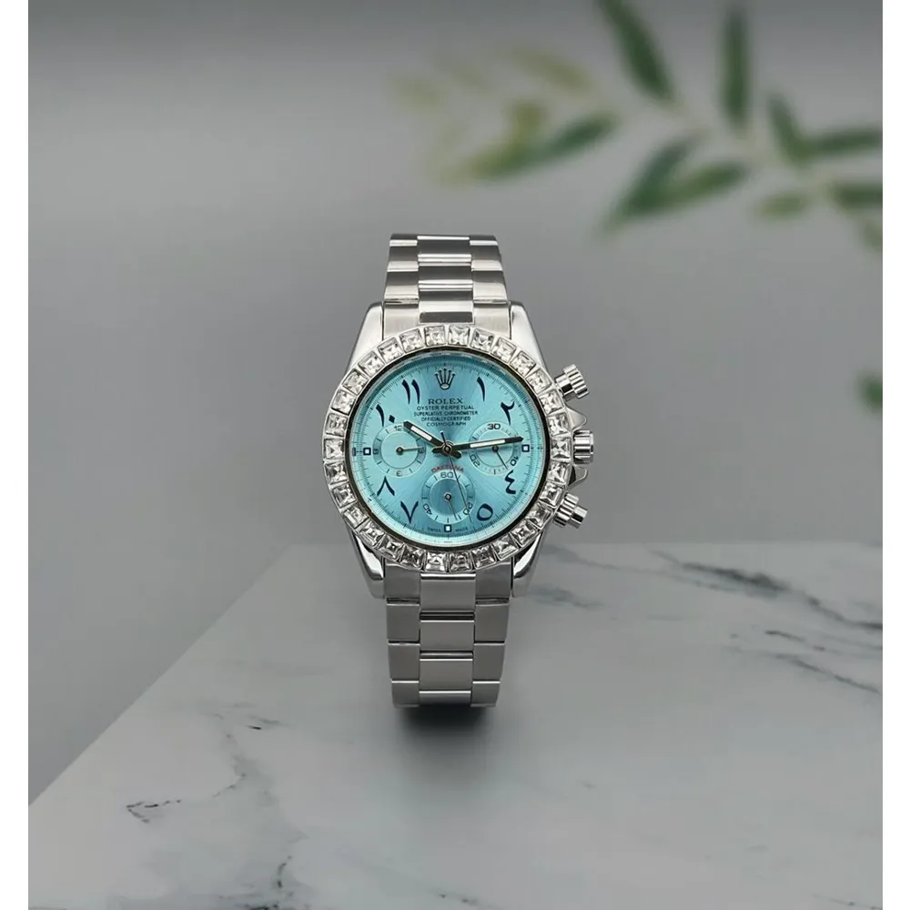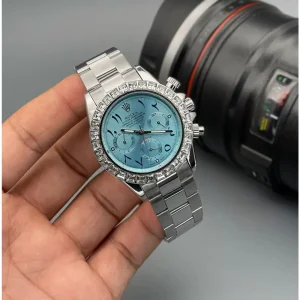 The Rolex Daytona Ice Blue Arabic Dial Watch is a premium timepiece designed for those who appreciate luxury, precision, and timeless style. Crafted with a bold 42mm case diameter and a slim 10mm case thickness, this watch offers a perfect blend of comfort and elegance, making it ideal for both casual and premium occasions. The standout feature is its distinctive Ice Blue dial, which gives the watch a refreshing, modern, and premium appearance. Whether you wear it for business, travel, or daily use, its eye-catching design ensures that you always make a confident style statement.
