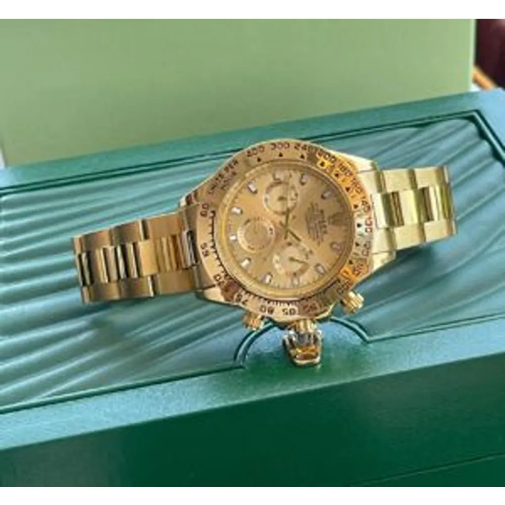 Crafted with high-quality components, the watch blends durability with elegance. The golden dial houses precision chronograph machinery that ensures long-lasting performance. Every detail is thoughtfully designed, including the original Rolex branding lock, which not only adds authenticity but also ensures the watch fits securely on your wrist.