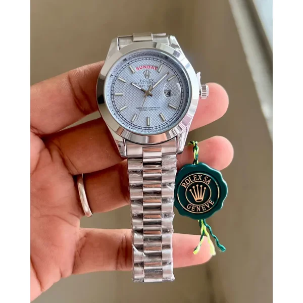 A special feature of this Day-Date edition is the heavy branding lock, designed to offer a secure and comfortable fit during long hours of wear. This strong clasp design ensures that the watch remains firmly in place, providing stability for daily use. Every component—case, bezel, movement, and lock—is crafted with precision to offer a luxury experience that feels premium on the wrist.