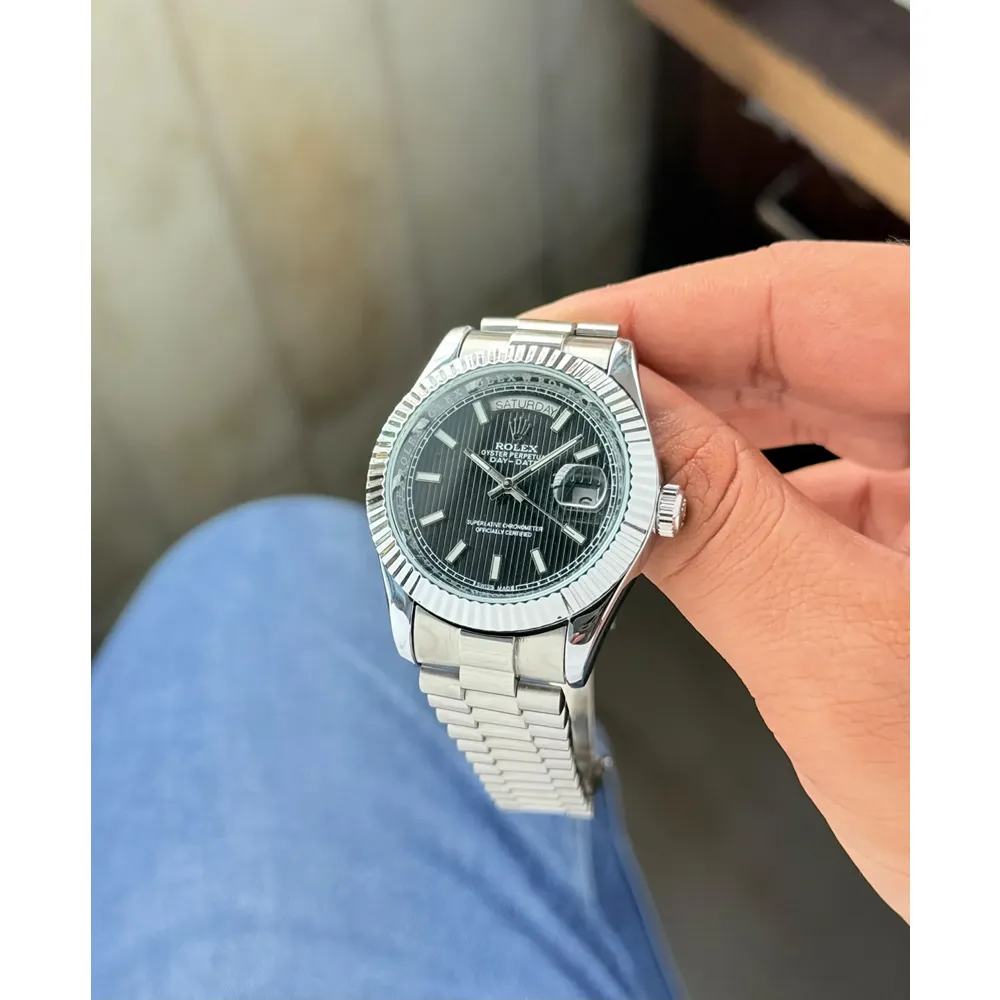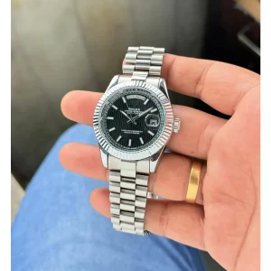 The Rolex Day-Date Stella Black Watch is a premium luxury timepiece crafted for men who appreciate a bold, sophisticated, and high-performance accessory. Designed with a robust 40mm stainless steel case, this watch commands attention while maintaining a timeless elegance. The stunning Stella Black dial enhances its premium appeal, featuring a fully functional Day and Date indicator that adds both practicality and charm to the design. Whether for business meetings, celebrations, or everyday wear, this watch delivers style with purpose.
