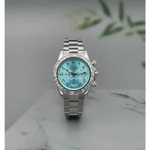 The watch features a breathtaking Ice Blue dial, a color associated with high-end Rolex editions, often seen only in elite collections. The Arabic numeral styling enhances its exclusivity and makes the watch look even more sophisticated and luxurious. Paired with a robust silver stainless-steel band, the watch achieves the perfect balance of elegance and masculine appeal.